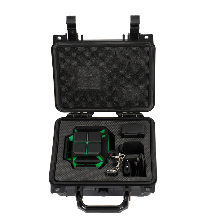 De behuizing van ADA LaserTANK 3-360 GREEN wordt aan alle kanten beschermd door een dikke laag rubber. Binnenin wordt een celstructuur gebruikt die perfect bestand is tegen invloeden van buitenaf, schokken tijdens het vallen. De behuizing van de koffer is verstevigd met verstevigingsribben en is bestand tegen stoten, vallen en verschillende gewichtsbelastingen. de grote clipsloten zijn handig in gebruik. De lijnlaser en accessoires worden bevestigd in de speciale zachte binnen structuur.