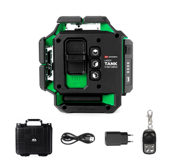 De laser is automatisch zelf nivellerend. De ADA LaserTANK 3-360 GREEN onderscheidt zich door zijn hoge nauwkeurigheid