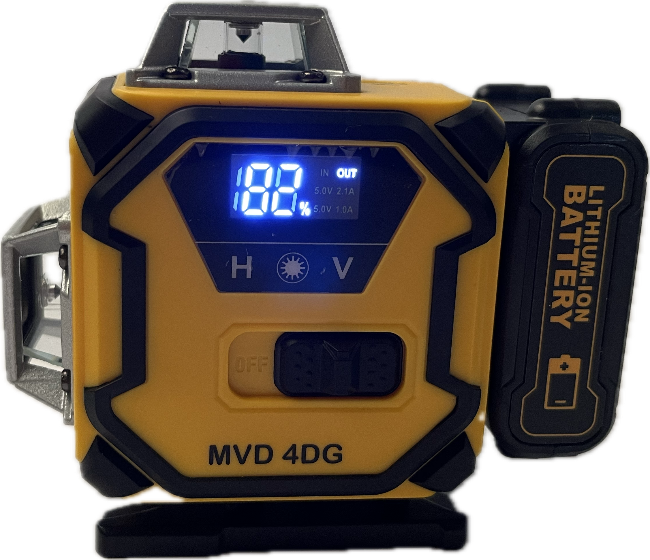 De MVD 4DG laser heeft aan de zijkant een schuifknop die de lijnlaser in- en uitschakelt. Zo is het binnenwerk van de laser in de uitgeschakelde stand vergrendeld en kan het daardoor tijdens transport niet beschadigen.