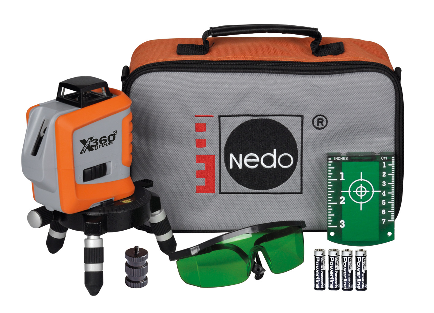 Levering: target, laserbril, batterijen, verloop adapter van 5/8″ naar 1/4″, statief met fijninstelling, beschermend tasje