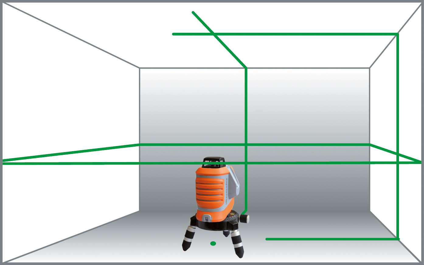 Zelfnivellerende multilijnlaser voor het waterpas stellen, uitzetten, in het lood stellen en het overbrengen van rechte hoeken in de interieurbouw. De groene laserlijnen zijn zeer goed zichtbaar. De doorlopende, horizontale 360o laserlijn maakt stelwerkzaamheden heel gemakkelijk. In het compacte huis zijn de beide verticale laservlakken exact haaks geplaatst. Hun snijas, het draaipunt van het statief en het loodpunt zijn hetzelfde. Daardoor is het bijzonder eenvoudig om de laser via een bekend punt te positioneren en rechte hoeken over te dragen. De fijninstelling maakt een snelle en exacte uitlijning van de assen mogelijk.