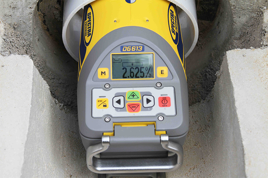 De DG613 van Spectra Precision is zo ontworpen, dat iedereen er direct mee aan de slag kan. Zo is hij uitgevoerd met een extra groot display dat alle belangrijke info in één oogopslag weergeeft. En niet alleen op de laser zelf, maar ook op de meegeleverde afstandsbediening. Het scherm van radioafstandsbediening RC803 geeft namelijk precies dezelfde informatie als het display van de rioollaser.
