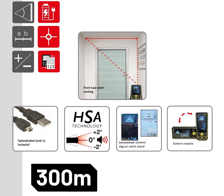 – Horizontale / verticale inclinometer met Punt -to Point -functie -indicator: het geeft de afstanden van 2 punten in de ruimte